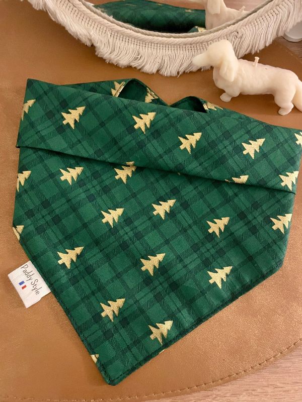 Bandana de noël pour Chien – Tartan Vert avec sapin Or