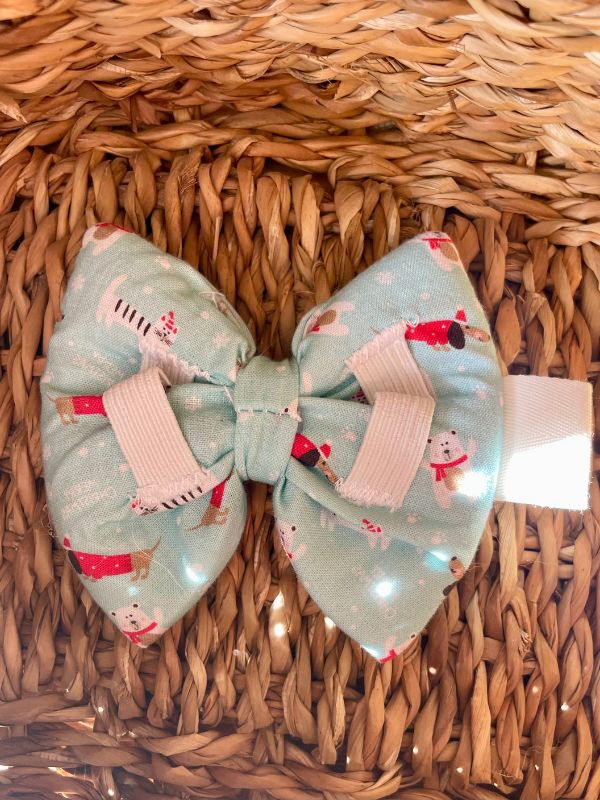 Faites briller votre chien pendant les fêtes avec ce nœud papillon bleu clair pour chien, orné d’un adorable motif teckel ! Cet accessoire pour chien s’enfile facilement sur le collier pour un look élégant, festif et plein de tendresse.