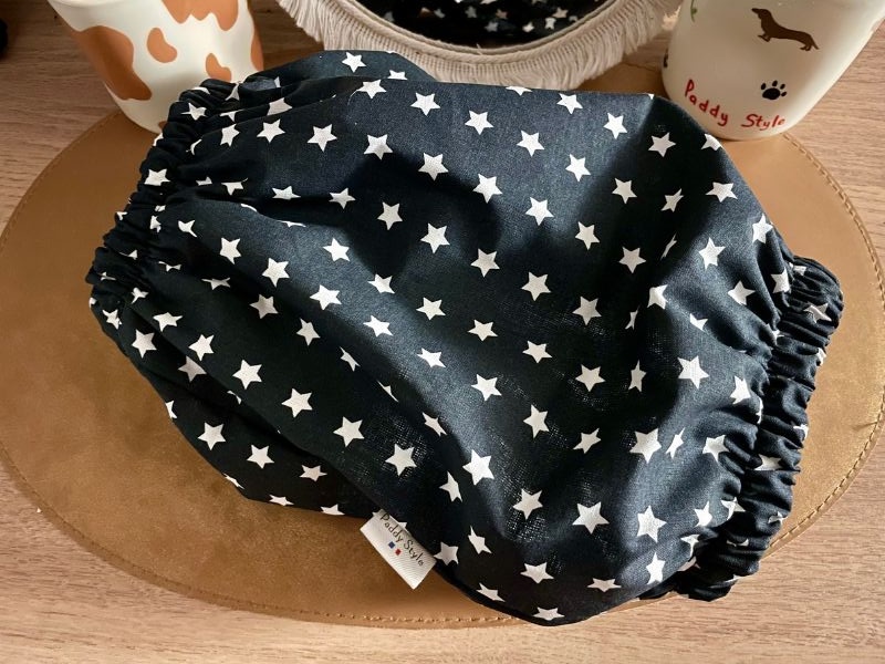 Chaque snood est fait main avec soin à partir d’un tissu 100 % coton de qualité. Le motif noir à étoiles blanches lui donne une allure chic et moderne. Parfaite pour les chiens élégants et leurs maîtres exigeants.